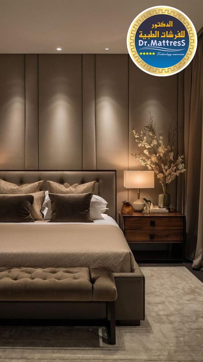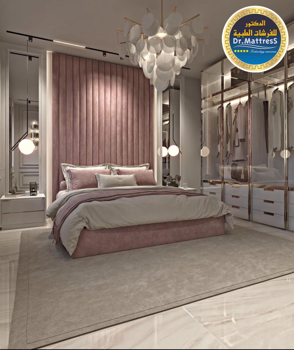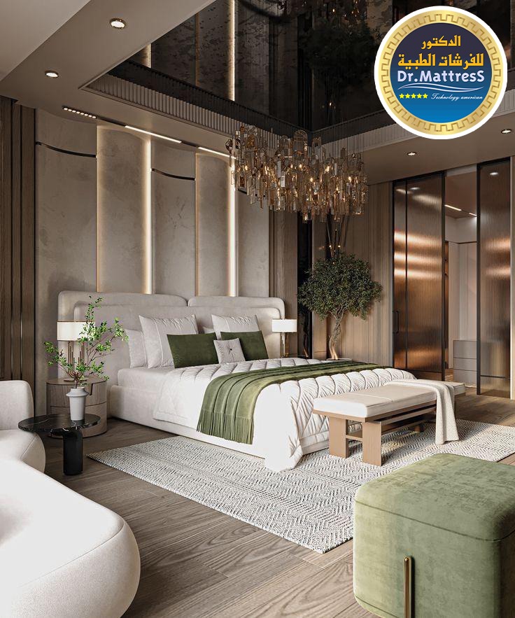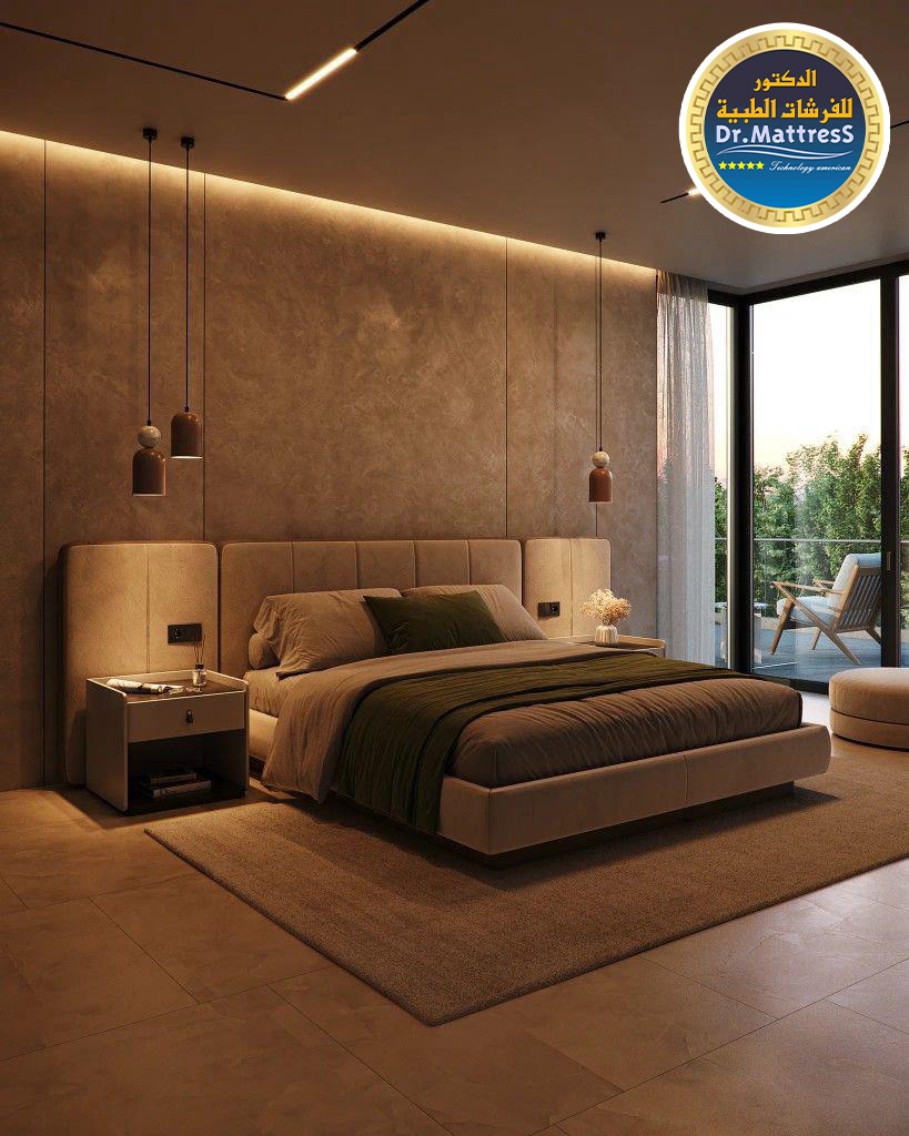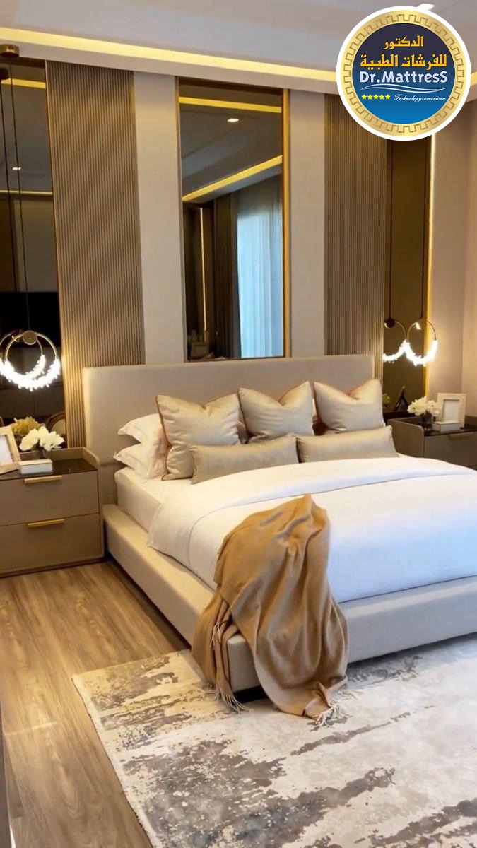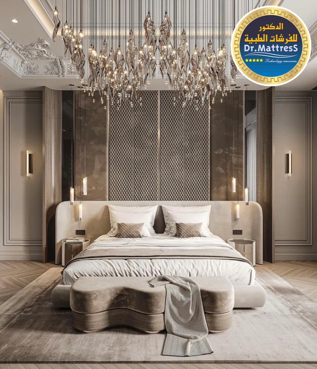 غرفة نوم تجمع بين الفخامة والهدوء بتصميم عصري راق يبعث على الراحة والاسترخاء ألوان متناسقة وناعمة تعكس احساس الدفء مع اضاءة هادئة تخلق اجواء مثالية