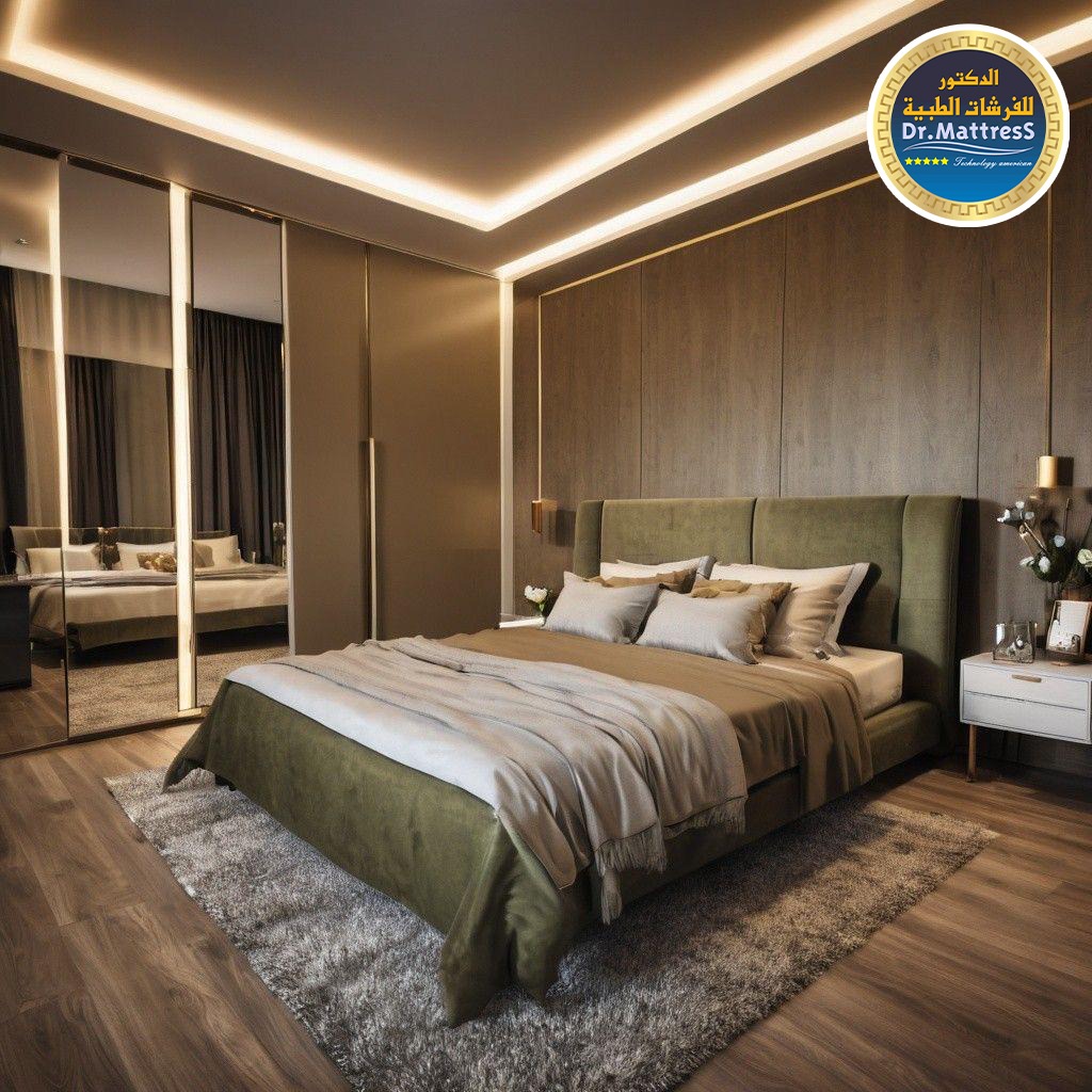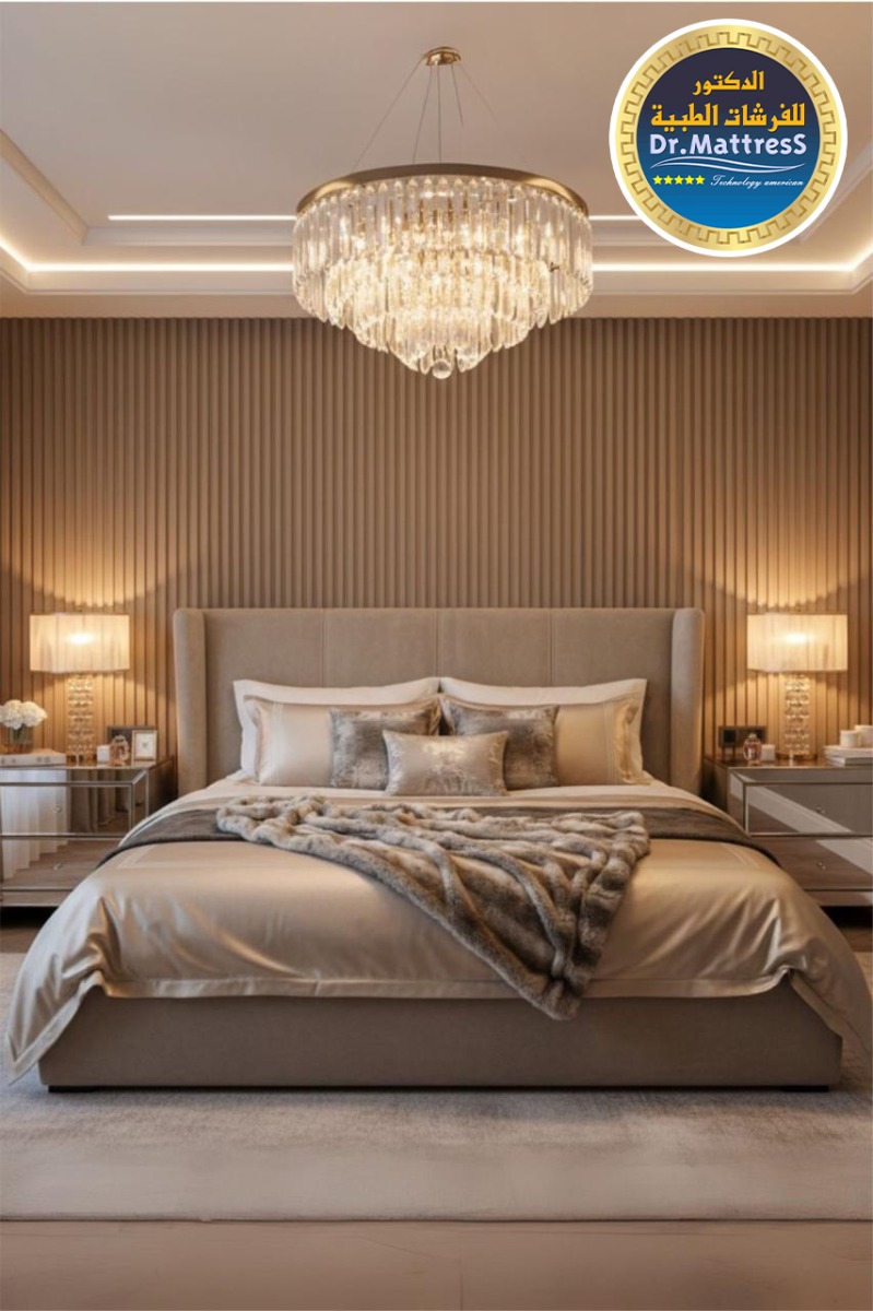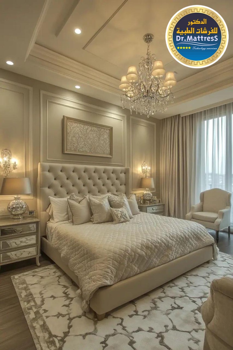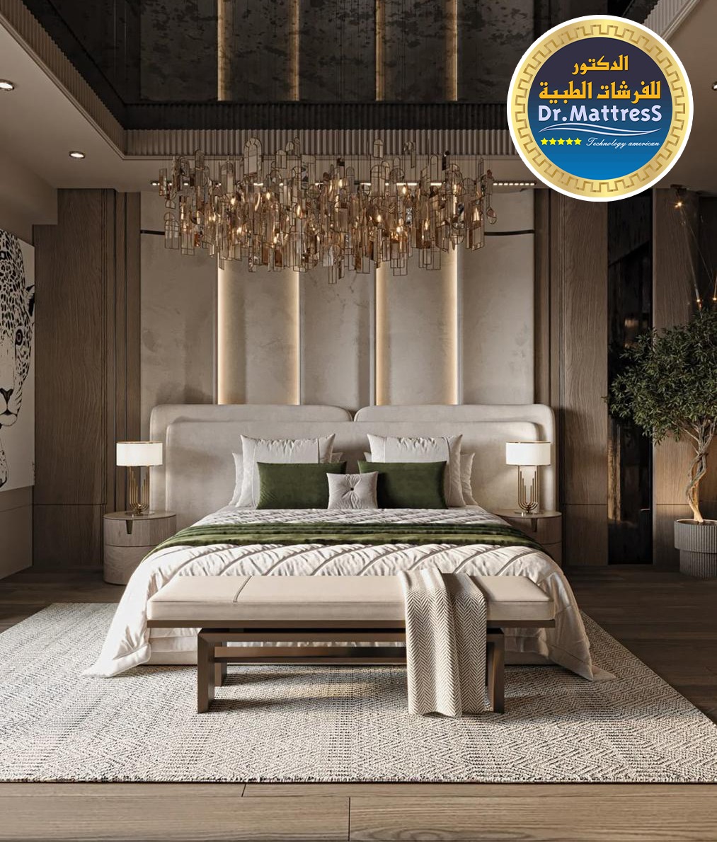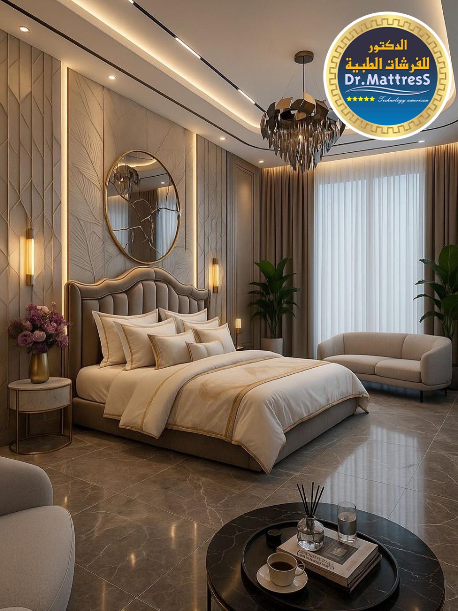 غرفة نوم تجمع بين الفخامة والهدوء بتصميم عصري راق يبعث على الراحة والاسترخاء ألوان متناسقة وناعمة تعكس احساس الدفء مع اضاءة هادئة تخلق اجواء مثالية