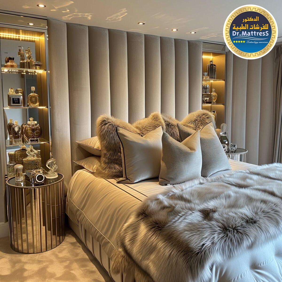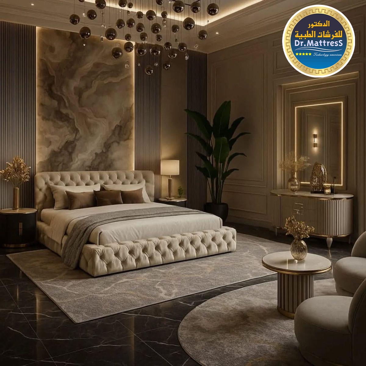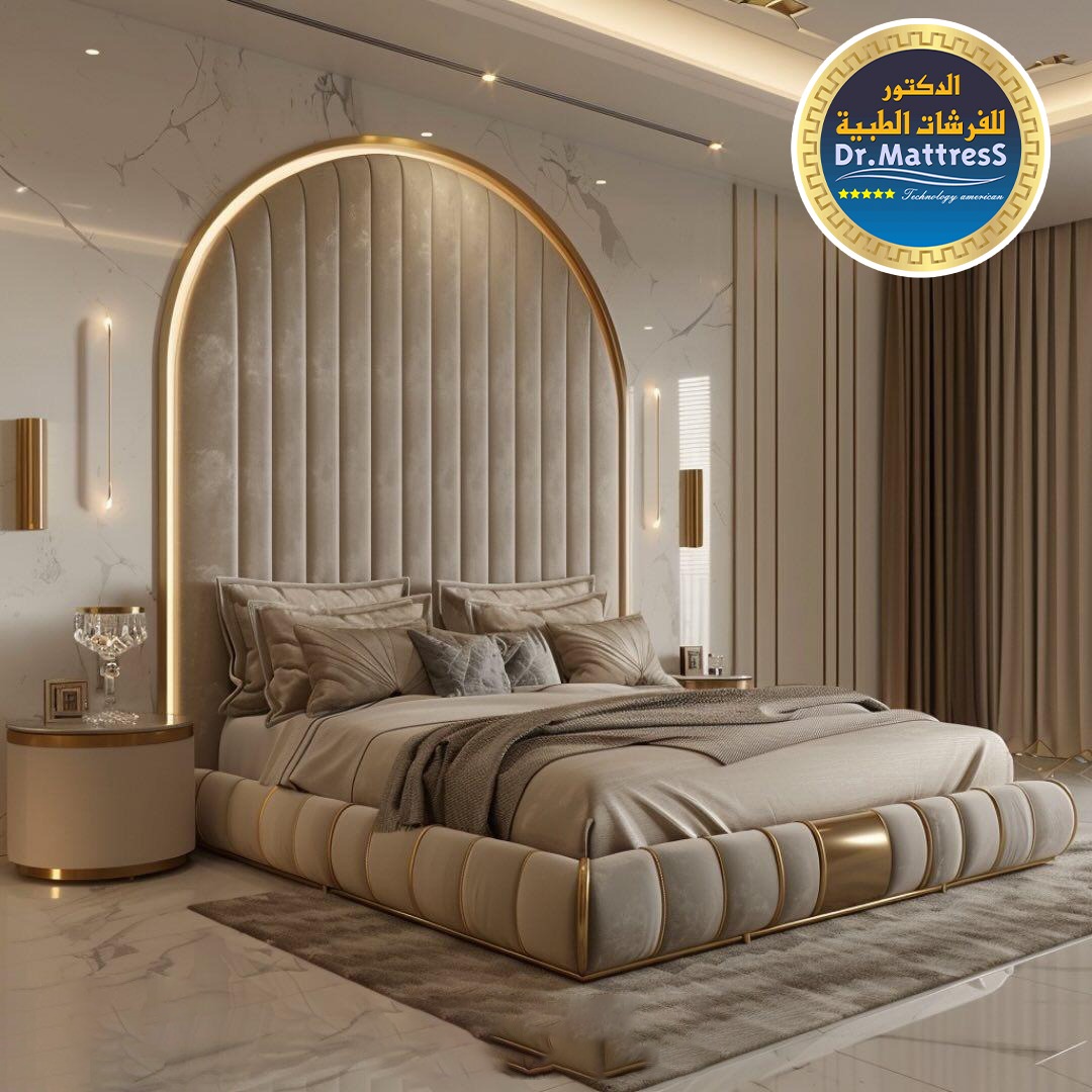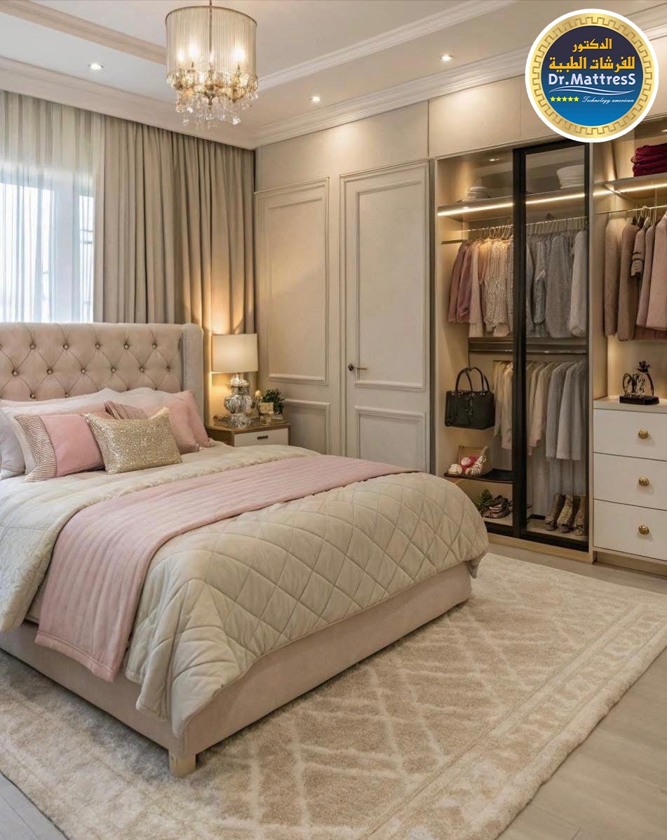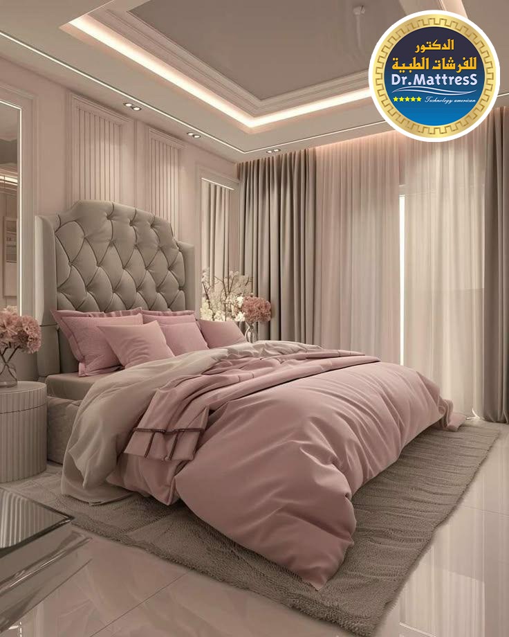 غرفة نوم تجمع بين الفخامة والهدوء بتصميم عصري راق يبعث على الراحة والاسترخاء ألوان متناسقة وناعمة تعكس احساس الدفء مع اضاءة هادئة تخلق اجواء مثالية